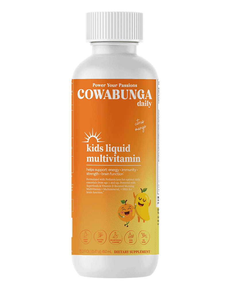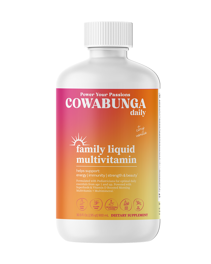 Liquids absorb faster and deliver more. Cowabunga’s Liquid Multivitamins and Total Body Nutrition shake give families everything they need—no junk, no fillers, just pure fuel.
