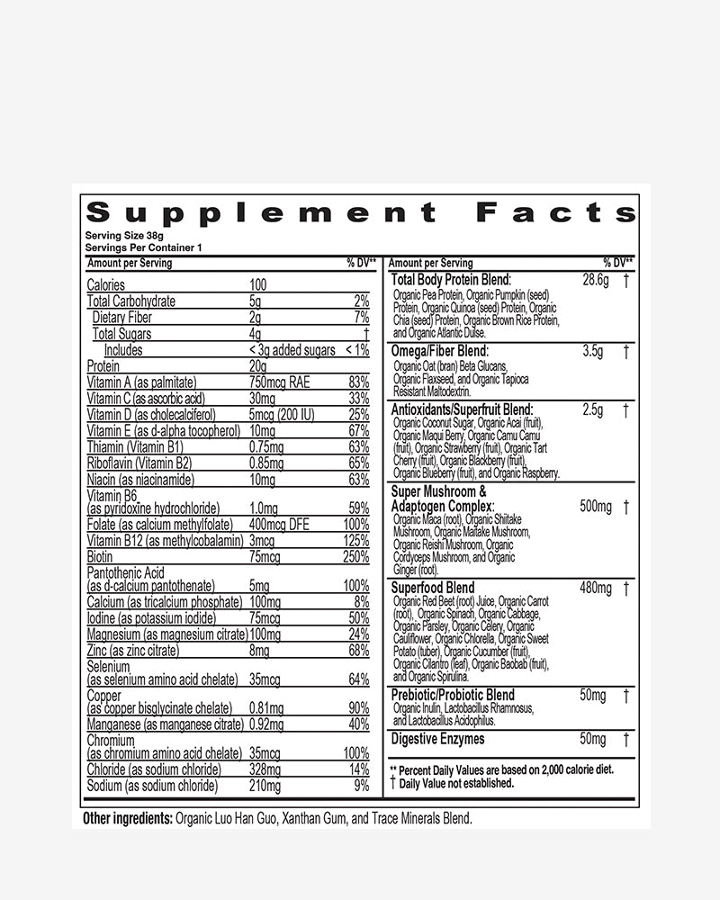 20g Protein + 73 Nutrients all in one. Our nutrition shake is formulated with a comprehensive blend of plant-based proteins, superfoods, vitamins, minerals, adaptogens, and probiotics.