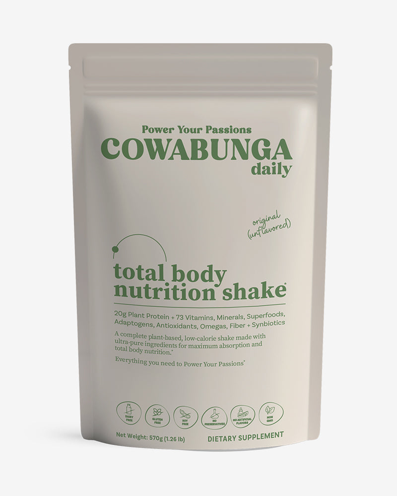 Cowabunga Daily’s Total Body Nutrition Shake delivers complete daily nutrition in one serving. Designed to support energy, recovery, gut health, and immunity — and made with ultra-clean ingredients.